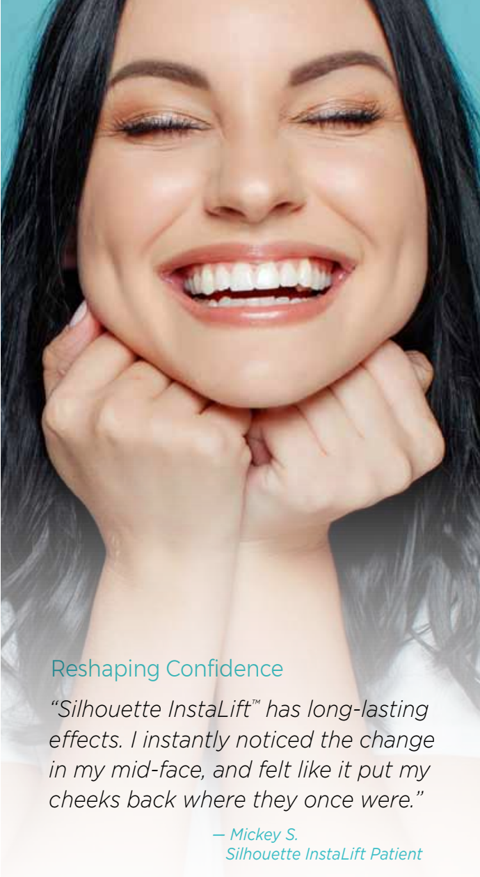 Silhouette InstaLift is a treatment unlike any other. Our Micro Suspension Technology is comprised of micro cones that are placed in the deepest layer of mid-facial skin. It delivers an immediate lift and gradually restores lost facial volume of the mid face by activating your own natural collagen production for a more youthful appearance that continues to improve over time. The sutures and cones are made from poly lactic-co-glycolic acid (PLGA), a well-known biomedical copolymer that is biocompatible and biodegradable.